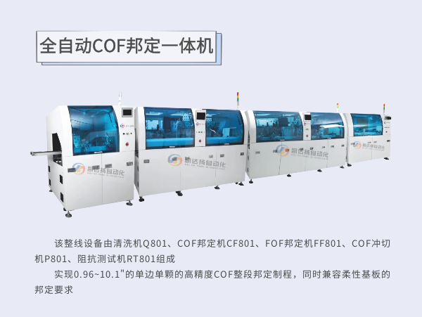 该整线设备由清洗机Q801,COF邦定机CF801,FOF邦定机FF801,COF冲切机P801,阻抗测试机RT801组成